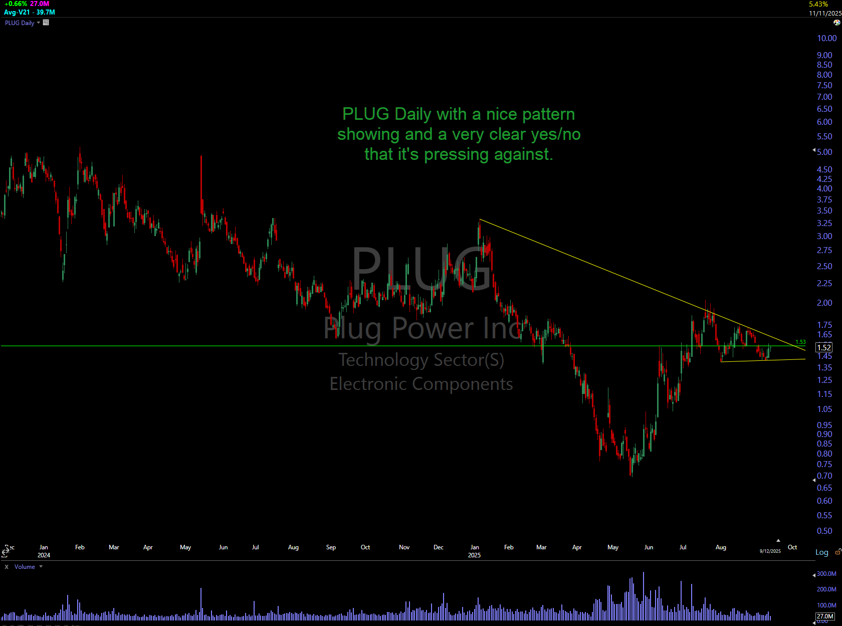 PLUG Daily chart above. Showing a clear pattern and yes/no line needed to overcome for higher prices.