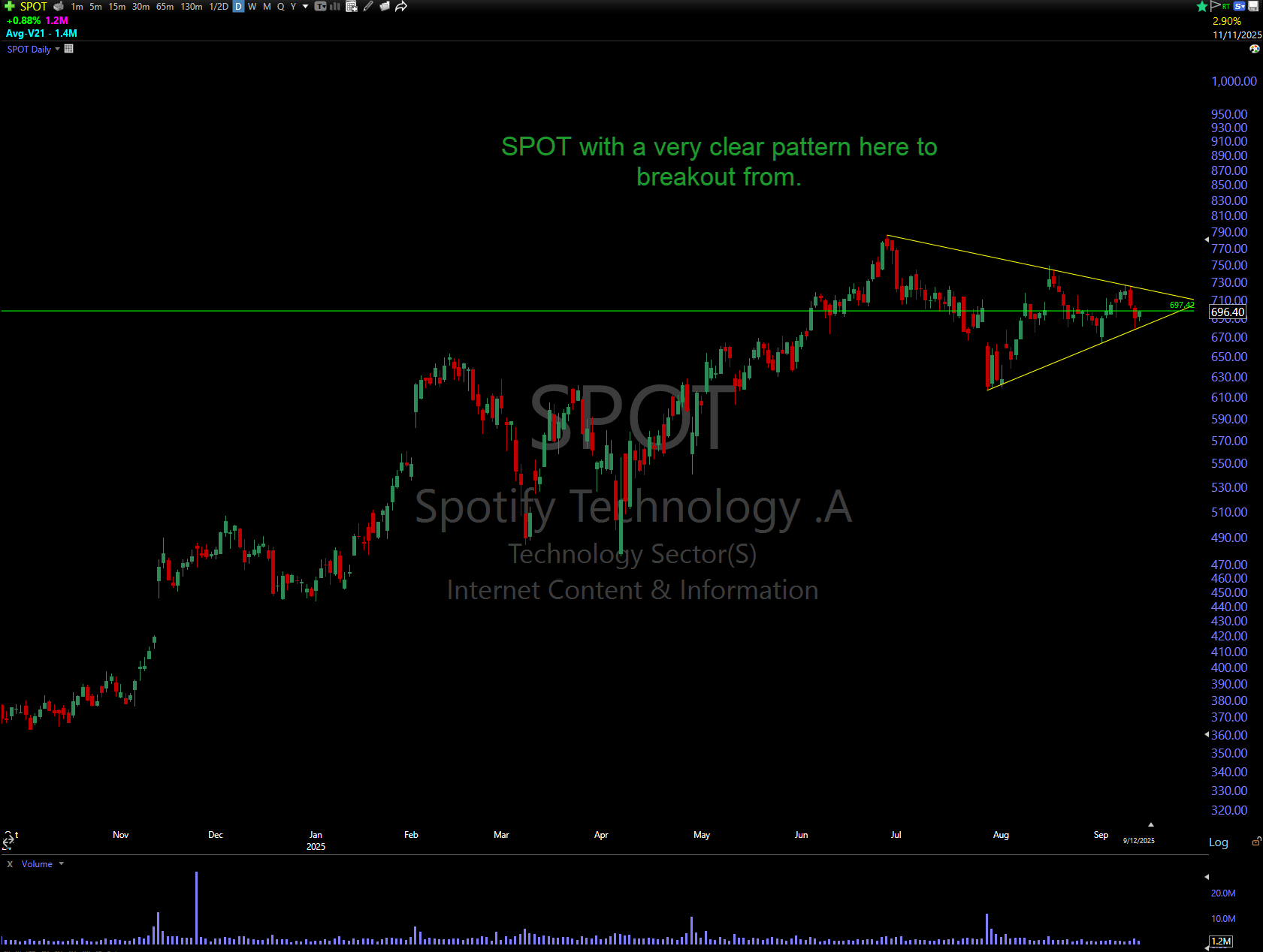 SPOT 15-minute chart above showing a clear yes/no line needed to break from. I'll be watching for a high volume bar above this area to play for the higher time frame (yellow) breakout above.